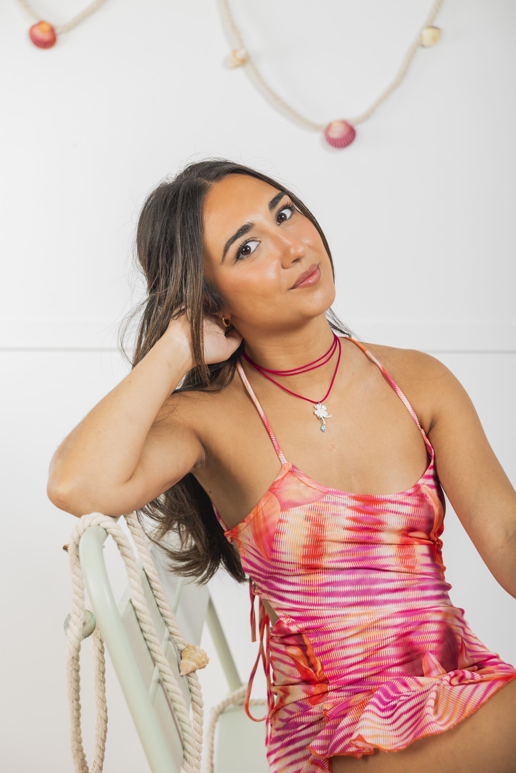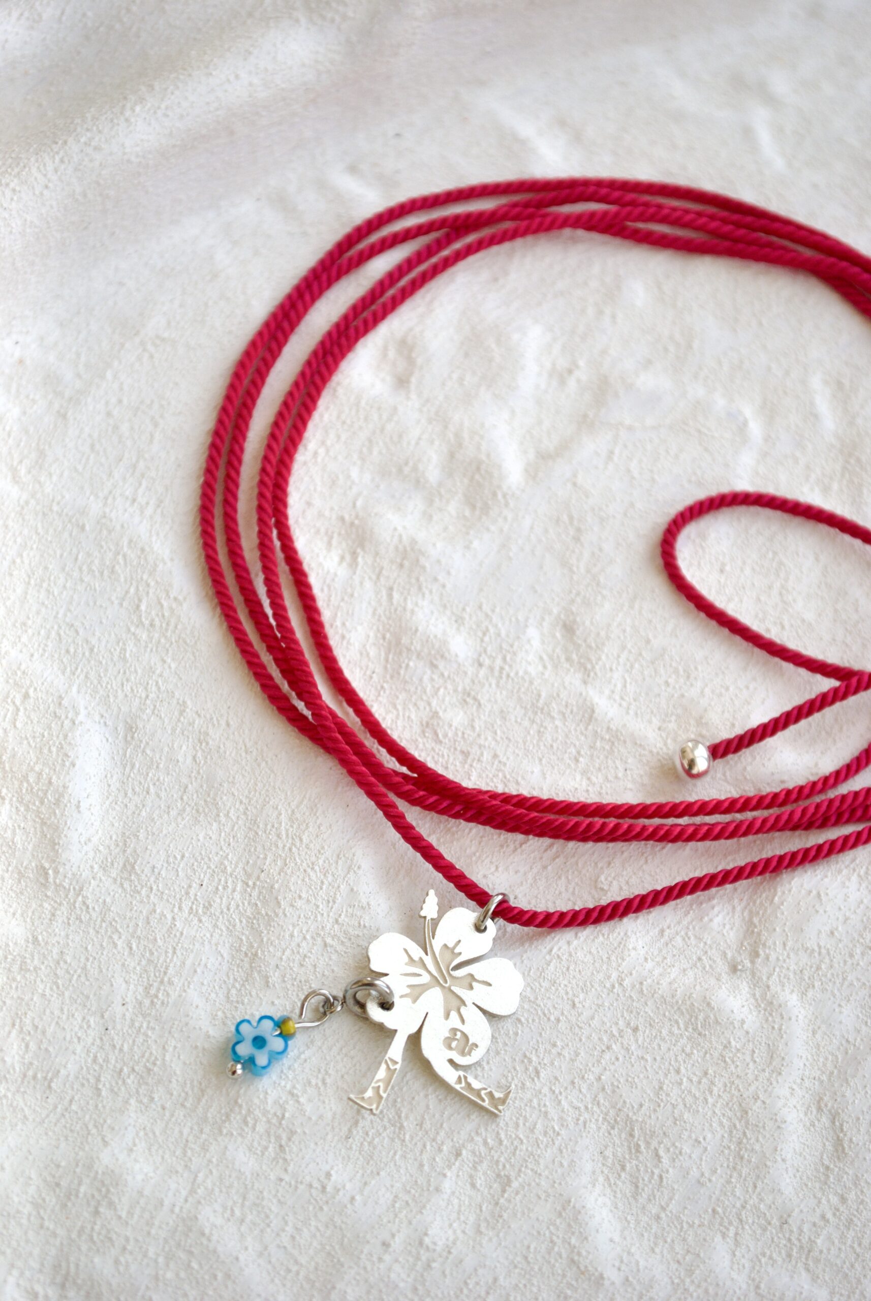 Collar Espetón, se compone principalmente de un charm en Plata de Ley de 2,5 cm de tamaño. De este charm cuelga un abalorio intercambiable enganchado por un mosquetón. El collar es acabado por terminales metálicos plata que acompañan a un cordón trendy de 2mm de poliéster en color magenta.